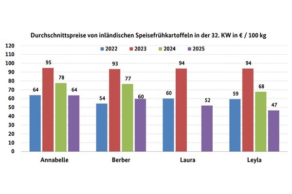 Am Kartoffelmarkt setzt sich die ruhige Marktlage fort. Alle Gebiete versorgen sich selbst, und so kommen keine wesentlichen Impulse durch das nahende Ferienende am Markt an. Selbst die weiter zurückgenommenen Preise werden bei großem Marktdruck unterboten. Negative Rekorde werden von den Industriekartoffeln vermeldet, hier ist die Notierung in NRW auf dramatische 1,50 EUR /100 kg eingebrochen. Zum Ende der Frühkartoffelsaison kann somit trotz guter Erträge und Qualitäten kein positives Fazit gezogen werden.