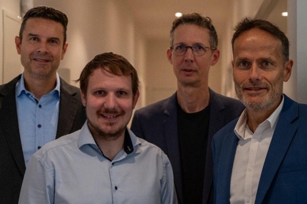 Von links nach rechts: David Käser, Leiter Division LANDI bei der fenaco, Elias Maier, Geschäftsführer Idée Coopérative, Michael Hermann, Geschäftsführer Sotomo, und Adrian Aebi, CEO Schweizer Hagel.