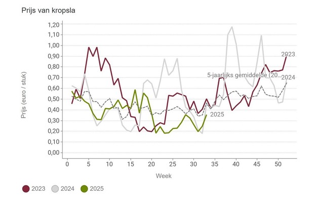 Der Markt für Salat ist weniger günstig. Die Preise lagen den ganzen Sommer über unter dem Fünfjahresdurchschnitt, stiegen in KW 33 jedoch leicht auf einen immer noch bescheidenen Durchschnitt von 0,35 EUR pro Kopf.