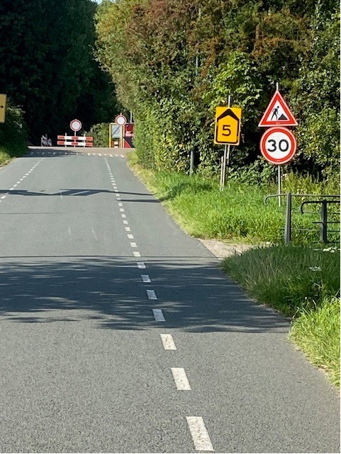 Soll ich lachen oder weinen: Zwei Straßenarbeitsmaßnahmen behindern einander: Die eine schickt uns über die Umleitung 5 geradeaus, die andere sperrt diese ab.