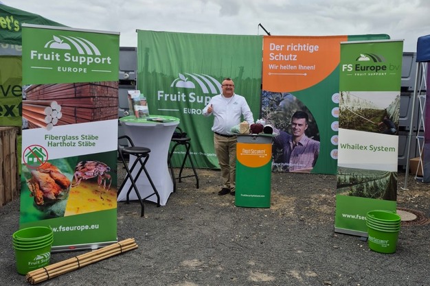 © Fruit SupportAndré van der Wiel präsentierte während des Apfeltags 2025 in Rheinbach ein breites Spektrum an Schutz- und Überdachungslösungen für den Obstbau. "Für uns bilden diese, regionalen Veranstaltungen eine kostengünstige und unkomplizierte Plattform mit potenziellen sowie Bestandskunden ins Gespräch zu kommen. Sie sind somit eine gute Ergänzung zu den großen Fachmessen wie der Fruit Logistica und Fruchtwelt Bodensee."