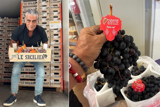 © Claudio RomanoLinks: Romano mit einer Kiste sizilianischer Red Globe. Rechts: Apulische kernlose Trauben