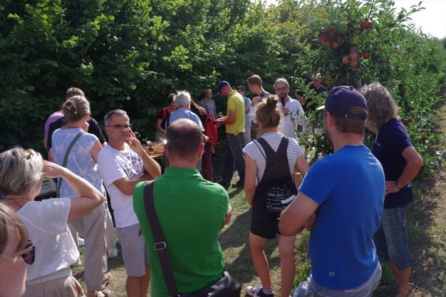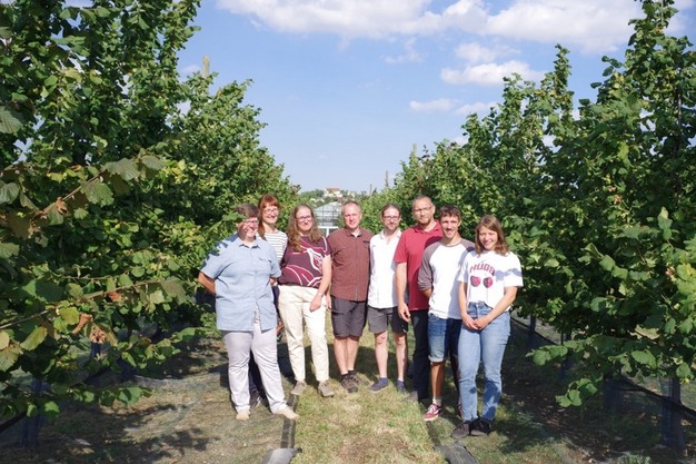 Dr. Martin Penzel zeigte den Teilnehmern anschließend im Versuchsfeld des LVG verschiedene Haselnusssorten auf der Unterlage Corylus colurna im 12. Standjahr sowie Dichtpflanzungen im 6. Standjahr und einen Unterlagenversuch. Die Teilnehmer konnten verschiedene Sorten verkosten. Zusätzlich wurde der Einsatz von Bodenfeuchtesensoren für eine gezielte Bewässerungssteuerung von Falk Eisenreich vom IMMS demonstriert.