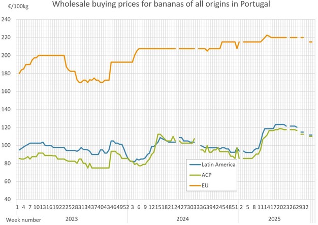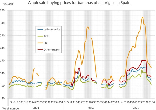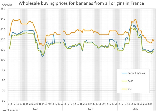 Den neuesten Marktdaten zufolge haben sich die Großhandelspreise für Bananen in mehreren europäischen Ländern zwischen KW 33 (bis 17. August 2025) und KW 34 (bis 24. August 2025) unterschiedlich entwickelt.