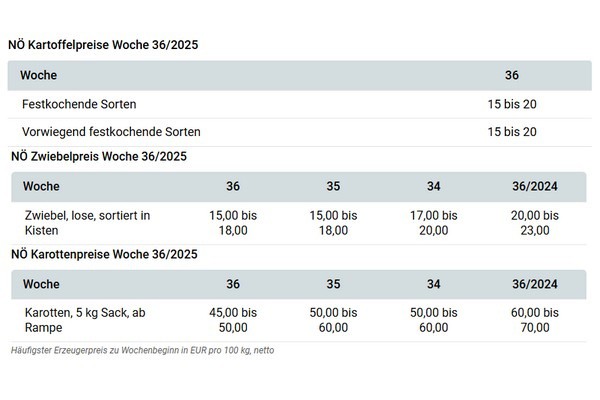 Der niederösterreichische Karottenmarkt präsentiert sich unaufgeregt. Das Ferienende in Ostösterreich sorgt am Inlandsmarkt für einen steigenden Absatz. Die Erntemengen sind weiterhin gut an den aktuellen Bedarf angepasst. Die Preise waren zuletzt leicht rückläufig. Zu Wochenbeginn wurde für Karotten im 5-kg-Sack, ab Rampe, je nach Qualität meist zwischen 45 und 50 Euro/100 kg bezahlt.
