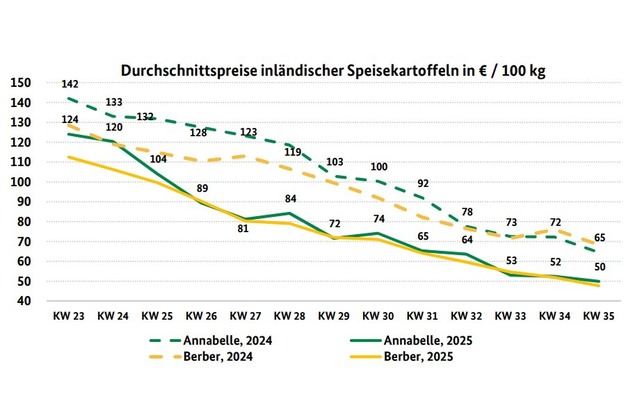 Am Kartoffelmarkt bleibt die Lage angespannt. Anhaltender Angebotsdruck drückt die Erzeugerpreise, auch wenn beim erreichten, niedrigen Niveau die Preisabschläge kleiner ausfallen. Aufgrund der angelaufenen Haupternte besteht wenig Hoffnung auf baldige Änderung der Marktlage. Die Belebung der Nachfrage durch das Ferienende war bisher von der Angebotsausweitung überlagert.