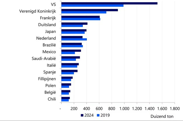 Zwischen 2019 und 2024 steigt der Exportwert von Tiefkühlkartoffelprodukten von 7,7 Milliarden US-Dollar auf 13,2 Milliarden US-Dollar. "Sowohl ein wachsender Markt als auch höhere Preise trieben den Anstieg des Exportwertes an, da die Kosten für den Anbau und die Verarbeitung von Kartoffeln weltweit deutlich gestiegen sind", sagt Cindy van Rijswick, Strategist für Obst und Gemüse bei RaboResearch. "Dieses Wachstum wurde auch durch erhöhte Importe in Ländern wie den USA, Großbritannien, Mexiko, Saudi-Arabien, Deutschland und Spanien angetrieben."