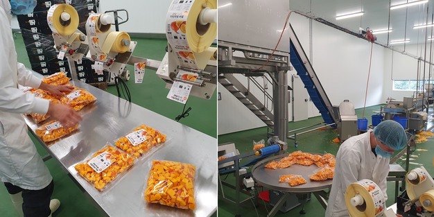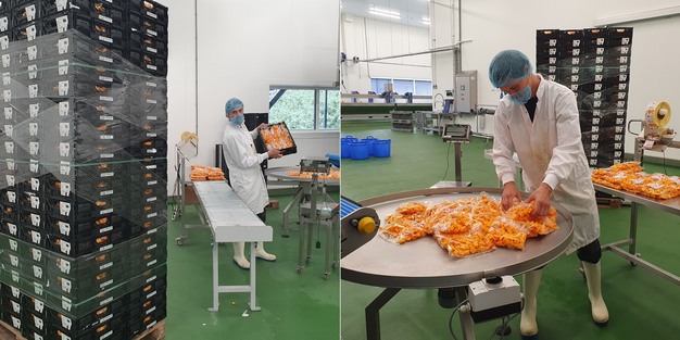 Vor einigen Jahren begann der Kürbisanbaubetrieb mit der ganzjährigen Lieferung eines neuen Halbfertigprodukts aus dem roten Hokkaido-Kürbis, sowohl halbe Kürbisse als auch in 10 oder 20 mm geschnittene Würfel aus der eigenen Schneideküche.