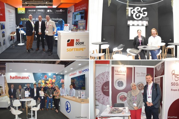 Deutsche Aussteller auf der Asia Fruit Logistica 2025. Im Uhrzeigersinn: Roland Wirth von der Frigotec GmbH bzw. Softripe mit den Kollegen von BG Door, Zara Buck und Mike Shaw von der T&G Global, einem Tochterunternehmen der BayWa AG, Dattelexporteurin Hind Mamdouh des ägyptischen Unternehmens Segam im Gespräch mit Moritz Cleff der deutsch-arabischen Wirtschaftskammer, und die Vertretung des Logistikdienstleisters Hellmann.