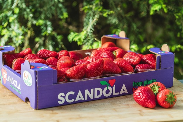 Neben Heidelbeeren baut Scandola Fruits auch Erdbeeren auf Substrat an, mit einer langen Saison von März bis Dezember. „Wir bauen auf 15 Hektar Erdbeeren an. Wir haben bereits mehr als 50 Jahre Erfahrung mit diesem Produkt. Der Favorit ist eine einlagige Verpackung mit 400 Gramm."