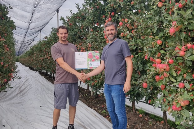 © EFC Abgebildet: Hans Goossens, Koordinator Neue Obstsorten bei EFC (rechts), überreicht den symbolischen Scheck des Hauptpreises an Florian Perathoner, KANZI®-Erzeuger in Südtirol (links).