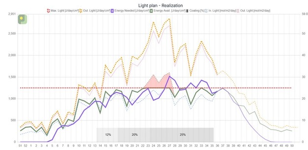 Es ist bekannt, dass Auberginen besser mit größeren Lichtmengen zurechtkommen, weil sie auch höhere Temperaturen vertragen, aber auch hier gibt es eine Grenze. Diese Grenze ist in ProJoules anhand von Lichtmessungen deutlich zu erkennen. Marcel räumt am Mittwoch ein, dass er auf ein PAR-Messgerät nicht mehr verzichten kann, vor allem jetzt, wo er die Ergebnisse der Arbeit mit den neuesten Erkenntnissen aus diesen Messungen, aus ProJoules und mit zusätzlichen Beschichtungen auf dem Gewächshausdach sieht.