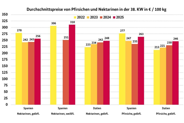 Spanische Pfirsiche und Nektarinen überwogen augenscheinlich, italienische Produkte folgten von der Bedeutung her. Türkische und französische Partien hatten laut BLE nur ergänzenden Charakter und trafen längst nicht an allen Plätzen ein. Die Verfügbarkeit verminderte sich. Auch die Qualität ließ verstärkt Wünsche offen, ein zu trockenes Fruchtfleisch war selbstredend kein Verkaufsargument. Zudem war eine gewisse Kundensättigung zu diesem späten Saisonzeitpunkt nicht von der Hand zu weisen. Die Notierungen tendierten in der Mehrzahl abwärts.