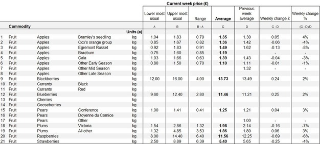 In der Kategorie Steinobst sind die Preise für Victoria-Pflaumen deutlich gesunken. Der Durchschnittspreis pro Kilogramm sank von 2,14 £ (2,44 EUR) in der Vorwoche auf 1,98 £ (2,26 EUR) in dieser Woche, was einer Differenz von 0,16 £ (0,18 EUR) oder 7 % entspricht.