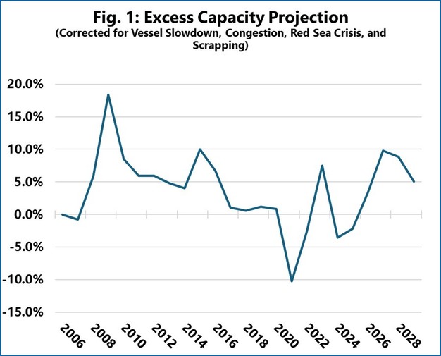 Nach dem korrigierten Modell wird erwartet, dass der Markt nach der letzten Phase der Kapazitätsengpässe in eine Phase ausgeprägter Überkapazitäten übergeht. Dieses Überangebot wird voraussichtlich 2027 seinen Höhepunkt erreichen, wenn auch nicht in demselben Ausmaß wie während der Finanzkrise 2009. Die Prognose geht davon aus, dass die Krise im Roten Meer bis Mitte 2026 gelöst sein wird, wodurch dem Markt wieder erhebliche Kapazitäten zur Verfügung stehen würden.