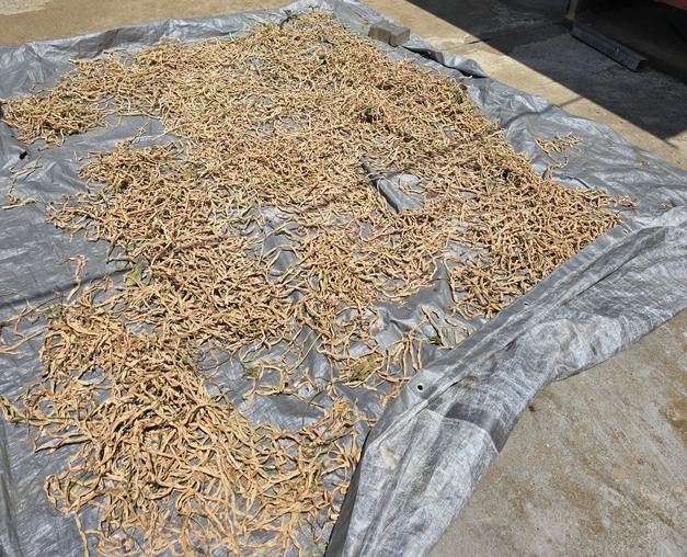 Spargelbohnen liegen zum Trocknen aus. Aus dem getrockneten Gemüse wird das Saatgut für die nächste Ernte extrahiert.