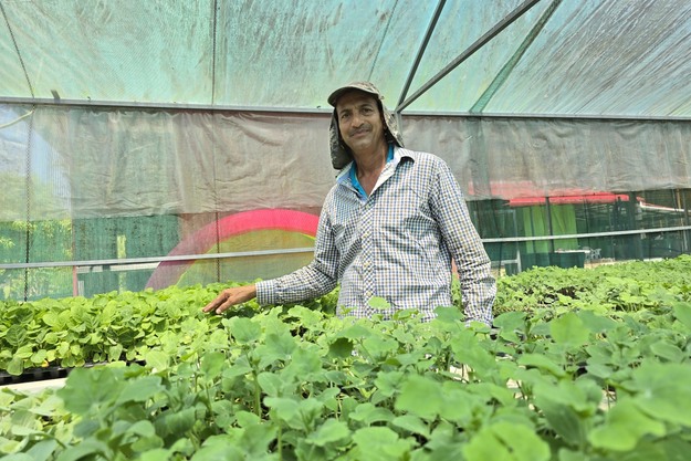 Bhiesnoe Gopal inmitten der Jungpflanzen