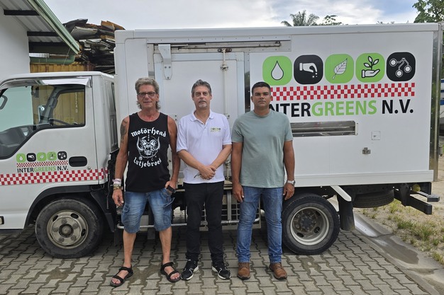 © Pieter Boekhout | FreshPlaza.deVon links nach rechts: Bas Slagter, pensionierter niederländischer Blumenkohlerzeuger, der heute regelmäßig über die Stiftung PUM in Suriname Unterstützung und Beratung im Agrarsektor leistet; Marnix Maenhoudt, Gründer und Eigentümer von Intergreens NV; Kenny van Dijk, ein surinamischer Unternehmer im Bereich Landwirtschaft und Landmaschinen, im Hintergrund der Kühlwagen, mit dem alles geliefert wird.