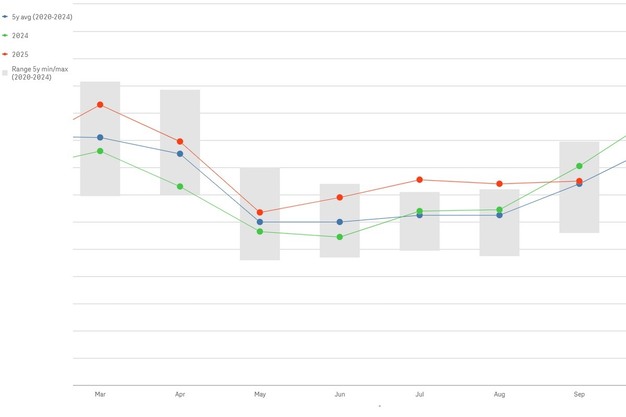 Die Preise für lose, runde Tomaten waren im September in Spanien deutlich niedriger als üblich. Der Kilopreis von 70 Eurocent ist 32 % niedriger als im vergangenen September und 24 % niedriger als in den zurückliegenden fünf Jahren.
