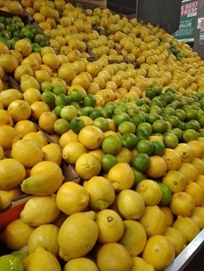 Rechts: Ein paar Limetten auf einem Berg von Zitronen in einer Filiale des Einzelhändlers Food Lover's Market