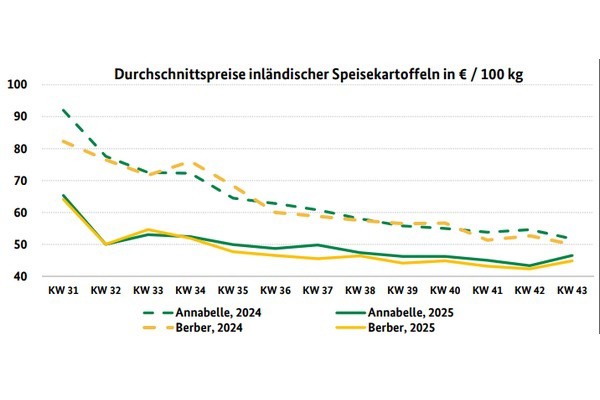 Am Kartoffelmarkt bleibt die grundsätzliche Marktlage unverändert. Die Ernte dürfte inzwischen bundesweit abgeschlossen sein, aus den Überschussgebieten bleibt dennoch ein Angebotsdruck aus Zwischenlagern bestehen. Im LEH finden sich zunehmend wieder Gebinde ab 5 kg, spürbare Impulse setzen aber weder Aktionen, noch der Export. Die Lager sind überdurchschnittlich gut gefüllt, Aufschläge für hochwertige Lagerware sind aber vorerst nicht absehbar.
