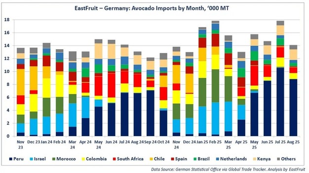 Peru bleibt der wichtigste Lieferant von Avocados nach Deutschland und dominiert die Lieferungen zwischen Mai und Oktober, während Südafrika im gleichen Zeitraum stark konkurriert. Chile liefert hauptsächlich von November bis Dezember, während Israel, Kolumbien und Marokko vor allem die Nachfrage von Januar bis März decken.