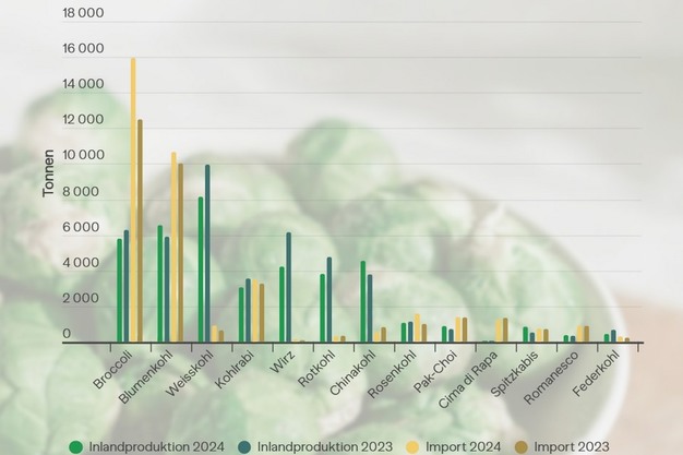 Der Anbau verschiedenster Kohlgemüsesorten hat in der Schweiz eine lange Tradition. Die inländische Produktion von Weißkohl ist mit mehr als 8'000 Tonnen die höchste, was wiederum zum hohen Eigenversorgungsgrad beiträgt. Bei Brokkoli hingegen ist man weiterhin auf Importe aus Südeuropa angewiesen.