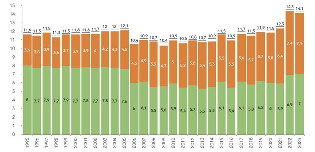 © diaNEOsisGrafik2 von diaNEOsis. Produktionswert, Vorleistungen und BWS der Landwirtschaft (in Milliarden Euro Preise 2024). Orange: Vorleistungen; grün: Bruttowertschöpfung.