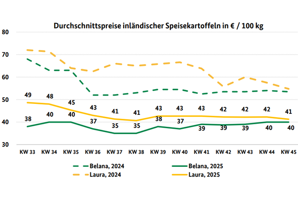 Der Kartoffelmarkt bleibt fortgesetzt ohne marktverändernde Impulse. Die Nachfrage konzentriert sich auf Aktionen im LEH, bei denen Preise um 0,50 EUR/kg ausgelobt werden. Außerhalb dieser Aktionen ist der Absatz schwach, auch Direktvermarkter sind mit den Umsätzen nicht zufrieden. Aus den Überschussgebieten besteht weiterhin Angebotsdruck mit Frischware. Eine Belebung der Nachfrage wird erst zum Weihnachtsgeschäft erwartet.