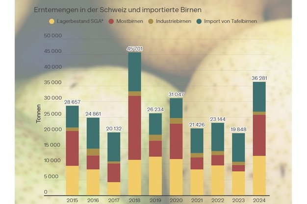 2024 befanden sich rund 12'550 Tonnen SGA-Birnen im Lager und fast 14'000 Tonnen Birnen wurden zu Most verarbeitet. Auch als Industrieobst werden Birnen verwendet und so wurden 1'000 Tonnen Birnen in Obstprodukten verwertet. 9'500 Tonnen Birnen stammten aus dem Ausland. Der Selbstversorgungsgrad der Schweiz bei Birnen lag 2019 bei 66 Prozent.