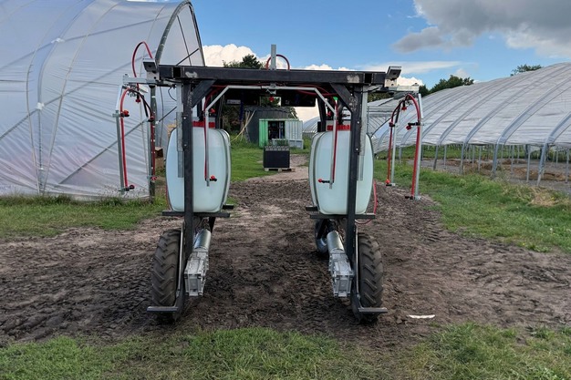 Der Spritzroboter VALERA Cube (unten im Bild) wurde für den geschützten Anbau und speziell für den Einsatz in Stellagen entwickelt. Er kann gleichzeitig drei bis sieben Reihen behandeln und verfügt über zwei große Tanks, die eine lange Einsatzdauer ermöglichen. Unterstützt durch Solartechnik erreicht er eine hohe Reichweite und arbeitet vollkommen selbstständig auf dem gesamten Gelände. Im Tunnel fährt der VALERA Cube sensorbasiert und präzise – auch nachts völlig autonom, erkennt dabei Hindernisse zuverlässig, stoppt oder umfährt sie selbstständig.