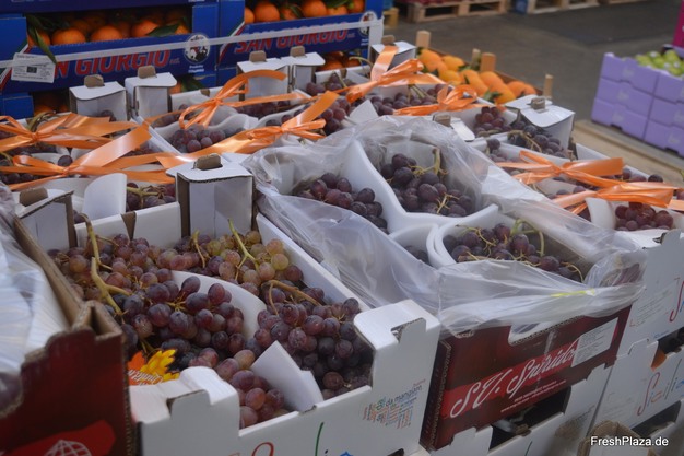 Während die Zitruskampagne zusehends Fahrt aufnimmt, neigt sich die Traubensaison dem Ende zu. "Wir bieten nun die letzten Sorten der Saison an, etwa helle Trauben der Sorte Kelly aus Apulien (unten im Bild) sowie blaue Allison-Trauben (oben im Bild) aus Sizilien. Es wurden Mitte/Ende Oktober bereits erste Übersee-Trauben offeriert, das ist wesentlich früher als noch vor 10-20 Jahren." Alles in allem blickt Di Bari jedoch auf eine erfolgreiche Traubensaison zurück: "Im Gegensatz zu den Orangen hat uns die Trockenheit hier einmal mehr in die Karten gespielt, sodass wir in puncto Mengen und Qualitäten aus dem Vollen schöpfen konnten."