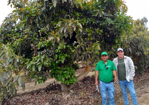 Guido García Mendoza (Betriebsleiter) und Claudio Villegas (Eigentümer des Hofs) vor einem Baum der Sorte Zutano. „Auf dieser acht Hektar großen Parzelle mit Hass-Avocados stehen etwa 105 Zutano-Bäume, die als Bestäuber dienen", sagt Villegas, der nach dreijähriger Zusammenarbeit mit der Grupo Juan Ruiz betont, dass er sich während des gesamten Anbau- und Vermarktungsprozesses begleitet und unterstützt fühlt. „Außerdem habe ich keine Verluste durch Obstausfälle, da die Gruppe die gesamte Produktion aufkauft."