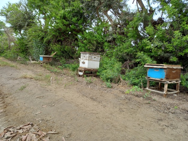 Bienenstöcke entlang einer Baumreihe, die das Grundstück vor Pilzbefall durch kalte und feuchte Winde vom fünf Kilometer entfernten Pazifik schützt.