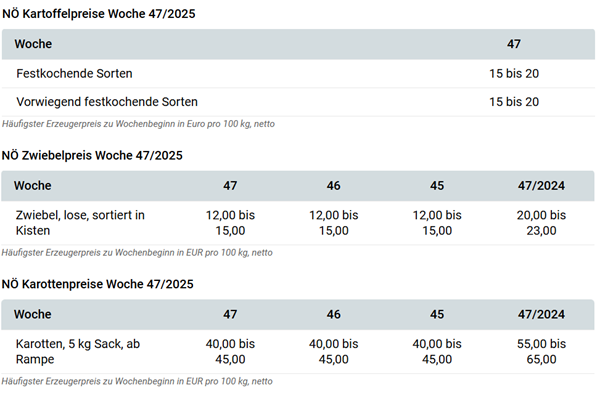 Die Einlagerung ist abgeschlossen, wobei aufgrund der sehr großen Erntemenge heuer mehr Erdäpfel als üblich in provisorischen Lägern liege. In den nächsten Wochen steht der Abbau der nichtfrostsicheren Lager im Vordergrund, auf belüftete Lager wird erst Richtung Weihnachten zugegriffen werden. An den qualitativ bedingten Aussortierungen hat sich laut LKÖ nichts geändert. Beim Absatz steht das Inlandsgeschäft im Vordergrund. Stetig laufende Aktionen sorgen für Impulse. Auch bei Bioware werden heuer LEH-Aktionen durchgeführt. Die Vermarktung im Export ist durch das EU-weit überreichliche Angebot, das die Preise stark unter Druck bringt, schwierig. Am Erzeugerpreisniveau hat sich keine Änderung ergeben. In Nordösterreich werden für gute Qualitäten bis zu 20 EUR/100kg bezahlt, wobei unverändert Abzüge für Logistikaufwände und Exportmöglichkeiten in Rechnung gestellt werden. In Oberösterreich bewegen sich die Preise für mittelfallende Ware, abhängig von der Sorte und der Qualität, meist zwischen 15 und 20 EUR/100kg.