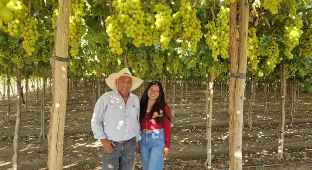 Jorge Nina Feria und Leidy Caso auf einem Feld mit Sweet Globe-Trauben, die Terramajes J&J auf einer Fläche von 2,5 Hektar anbaut. „Das Ziel ist es, 50-60 Tonnen pro Hektar zu erreichen", sagt Nina.