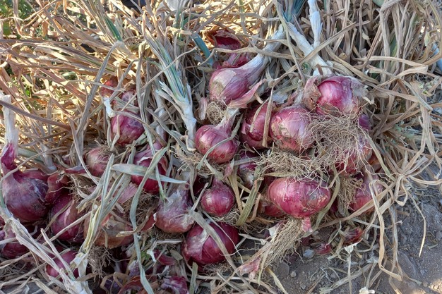 In der Region Majes funktioniert auch der Anbau von roten Zwiebeln sehr gut. „Wir erreichen Erträge von bis zu 50-60 Tonnen pro Hektar", sagt Nina. „Die Zwiebeln werden sechs Tage lang auf dem Feld getrocknet."