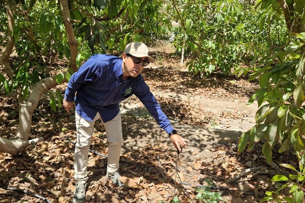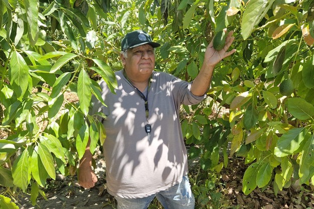 Carlos Cornejo, ein Erzeuger, der Inka Select Fruit angeschlossen ist, neben einem fünf Jahre alten Baum, dessen Avocados im März geerntet werden. Carlos war der erste Erzeuger, dessen Früchte von Inka Select nach China exportiert wurden.