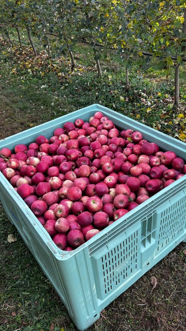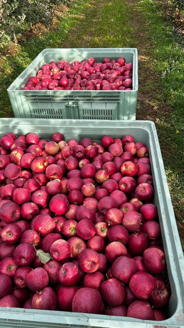 Die Ernte der Apfelsorte MC38 CrimsonSnow ist noch nicht ganz abgeschlossen. „Wir sind bei etwa 90 %, es hängen also noch Äpfel an den Bäumen, die gepflückt werden müssen", sagt Tallone. „Der Schnee und die leuchtend roten Äpfel bilden einen besonderen Kontrast, ein wunderschöner Anblick."
