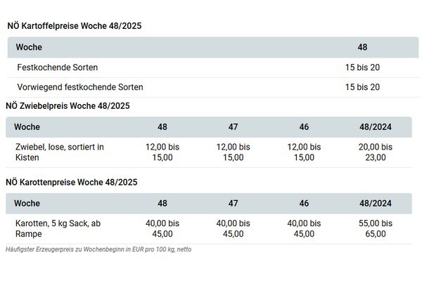 Die Ernte der niderösterreichischen Karotten ist mittlerweile so gut wie abgeschlossen. Das Gesamternteergebnis fällt heuer durchschnittlich aus, qualitativ gibt es Probleme mit Mäusefraß. Die Absatzseite präsentiert sich im Inland saisontypisch ruhig, aber stetig. Exporte sind bislang kaum ein Thema. Preislich gibt es keine Änderungen zur Vorwoche. Zu Wochenbeginn wurde für Karotten im 5-kg-Sack ab Rampe je nach Qualität meist zwischen 40 und 45 EUR/100 kg bezahlt.