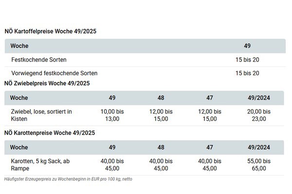 Die Ernte der niederösterreichischen Karotten ist nun weitgehend abgeschlossen, die verbleibenden Bestände dürften in den nächsten Tagen aus dem Boden geholt werden. Der Markt wird derzeit von den Landwirten bedarfsgerecht versorgt. Der Inlandsabsatz läuft stetig auf saisonüblichem Niveau. Bei den Preisen gibt es keine Änderung zur Vorwoche. Zu Wochenbeginn wurde für Karotten im 5-kg-Sack ab Rampe je nach Qualität meist zwischen 40 und 45 EUR/100 kg bezahlt.
