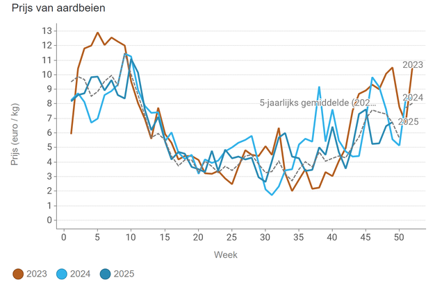 Der Durchschnittspreis für Erdbeeren lag am Ende der KW 49 bei 6,76 EUR/kg. Damit erreicht der Preis wieder den Fünfjahresdurchschnitt, der in der vergangenen Woche unterschritten wurde.