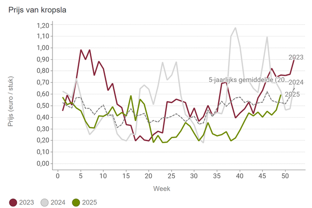 Der Durchschnittspreis für Kopfsalat ist in der vergangenen Woche über den Fünfjahresdurchschnitt gestiegen. Das ist das erste Mal seit Anfang Mai. Der durchschnittliche Stückpreis in KW 49 liegt bei 60 Cent.
