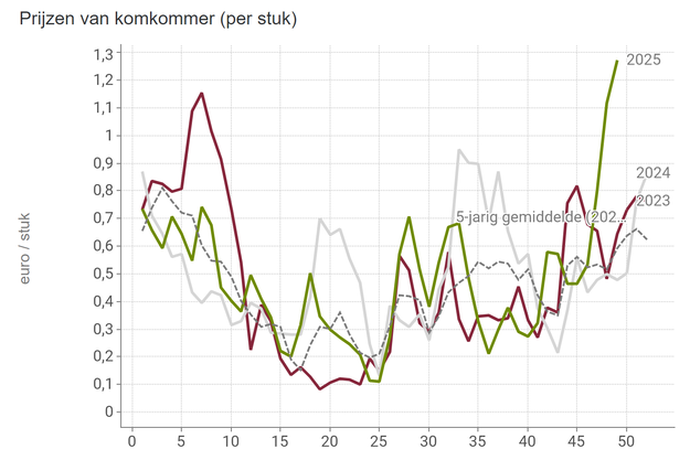 Der Preis für Pepino Frances, eine längliche Gurke, erreichte am 6. Dezember einen Höchststand (1,59 EUR/kg), woraufhin der Preis wieder sank. Auch der Preis für Pepino Almería, ebenfalls eine längliche Gurke, stieg in letzter Zeit stark an, auf 2,41 EUR/kg. Der Preis ist hier seit dem 5. Dezember wieder gesunken. Auch für spanische Verhältnisse sind die aktuellen Preise außergewöhnlich hoch.