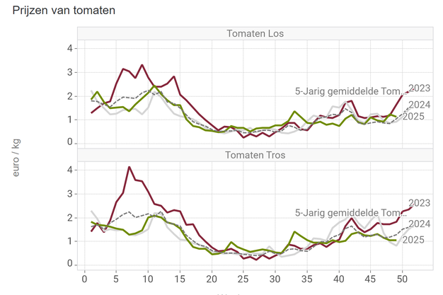 Der durchschnittliche Kilopreis für Strauchtomaten lag am Ende der KW 49 bei 1,07 EUR/kg. Damit ist der Preis hier unter den Fünfjahresdurchschnitt gefallen. Mit gut 1,13 EUR/kg liegt der Durchschnittspreis für lose Tomaten jedoch knapp über dem Fünfjahresdurchschnitt.