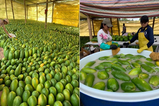 © Green Control Links: Alex Bustos (links) in einem Feld mit Solo Sunrise Papayas. Rechts: Passion Red Papayas.