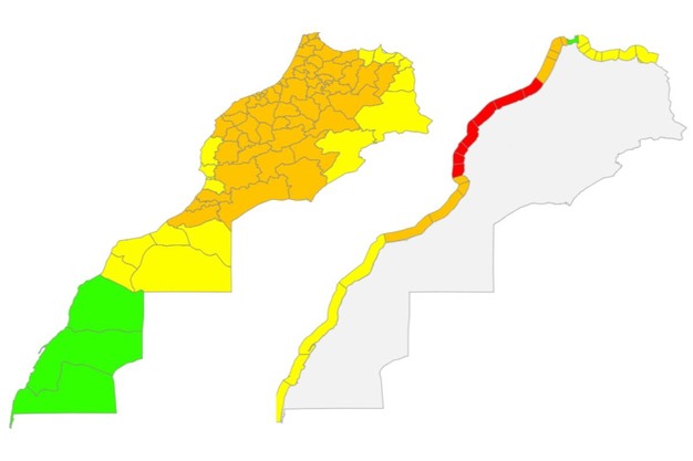 Die Bilder zeigen Warnungen für Marokko nach dem Sturm Emilia, der seit dem 13. Dezember katastrophale Schäden verursacht hat, insbesondere in Safi. Die Küstengebiete im Norden und in der Mitte sind rot und orange markiert (hohes Risiko), während das Landesinnere überwiegend gelb und orange markiert ist, was ebenfalls auf Wachsamkeit hinweist.