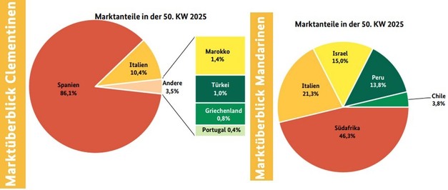 Bei den Clementinen bildeten spanische Partien die Basis des Sortimentes. Daneben konnte auf italienische Offerten, meist mit Blatt, zugegriffen werden. Wenige Importe aus Marokko, der Türkei, Griechenland und Portugal ergänzten das Geschehen. Die von der portugiesischen Algarve stammende Mioro-Clementine überzeugte mit süßer-aromatischer Premiumqualität. Satsumas stammten laut BLE ausschließlich aus der Türkei und gewannen ein wenig an Bedeutung.