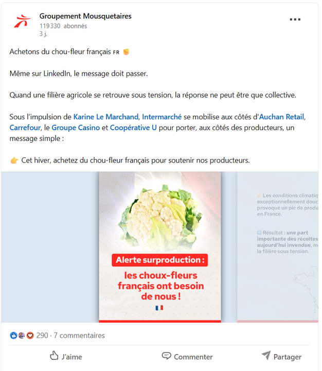 In einer gemeinsamen Pressemitteilung haben französische Einzelhändler ihre Unterstützung für den französischen Blumenkohl angekündigt, nachdem Karine Le Marchand sie dazu aufgerufen hatte, sich zu mobilisieren. Auf der Internationalen Landwirtschaftsmesse 2025 in Paris bekundeten Auchan, die Casino-Gruppe, Carrefour, Coopérative U und Intermarché ihren Wunsch, angesichts der Krisen in der Landwirtschaft zusammenzuarbeiten. In einer gemeinsamen Pressemitteilung kündigten sie ihre Unterstützung für französischen Blumenkohl an. „Die Maßnahmen zur Sensibilisierung der Verbraucher werden ab dem 20. Dezember in allen unseren Filialen intensiviert, als Fortsetzung der bereits umgesetzten Aktionen. Die Blumenkohlkampagne ist Teil einer gemeinsamen Initiative zur Einrichtung eines Schnellwarnsystems für den Fall einer Agrarkrise."