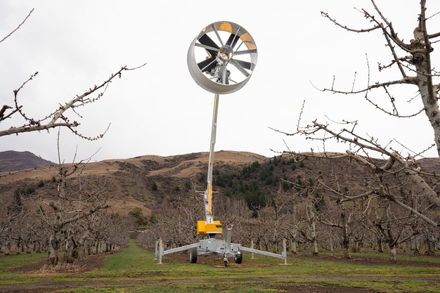 Als eines der ersten Obstunternehmen investierte der Vater von Wouter Theunissen vor einigen Jahren in die mobilen Windräder von Frost Fans, die nach einem alten Prinzip arbeiten, bei dem die warme Luft aus der Inversionsschicht nach unten gezogen wird und sich mit der kalten Luft am Boden vermischt.